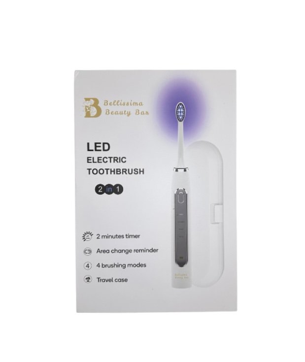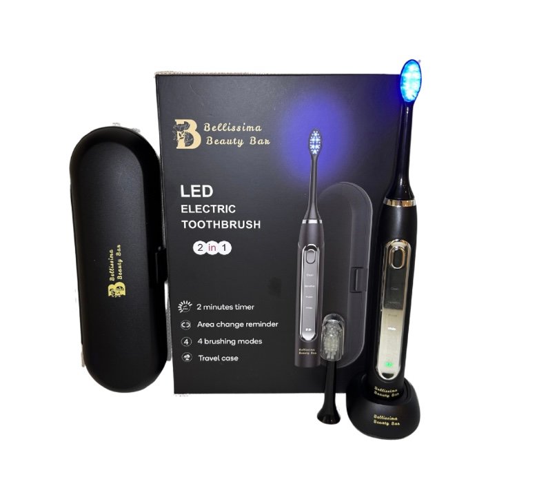 This sleek 2-in-1 LED electric toothbrush features 4 modes (Clean, White, Sensitive, Polish), Equipped with a 2-minute timer, USB rechargeable and travel case included. Used best after 1 hour professional whitening session at Bellissima Beauty Bar.
